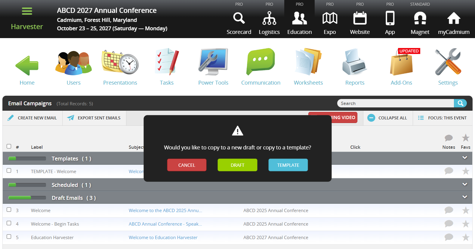 Email templates allow Education Harvester administrators to quickly send pre-made emails to users. These templates can be used multiple times and are accessible across all Education Harvesters your organization has purchased.