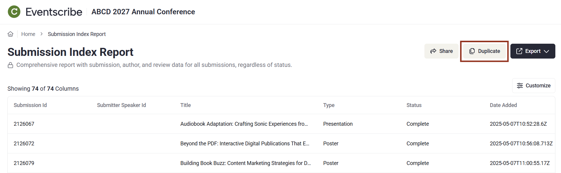 • Select the quick menu (︙) next to the report you want to copy and select Duplicate